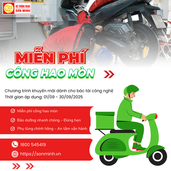 Từ 11/08 – 30/09/2025, khi các bác tài công nghệ đến sửa xe tại Hệ thống HEAD Sơn Minh, sẽ được MIỄN PHÍ TIỀN CÔNG khi thay thế các phụ tùng hao mòn (áp dụng mức phí công đến 220.000đ).