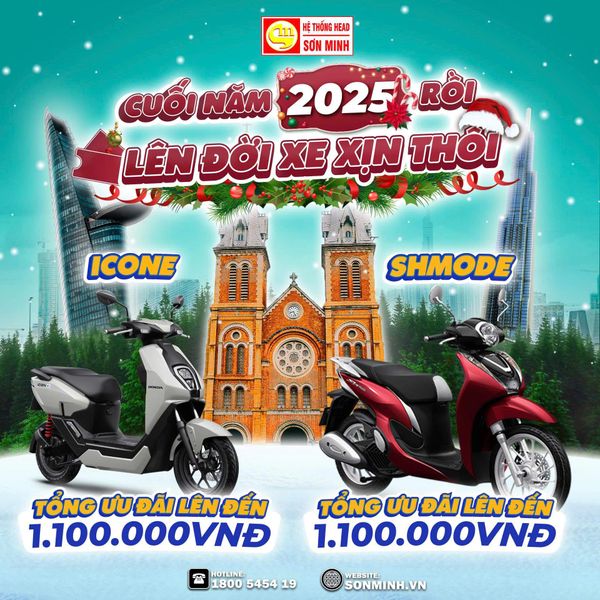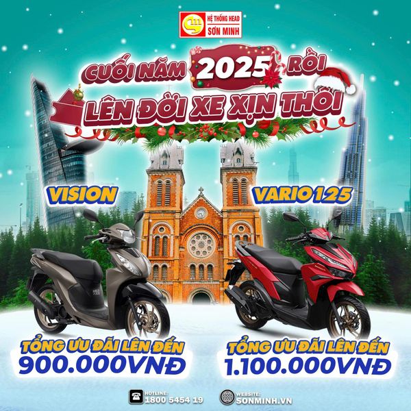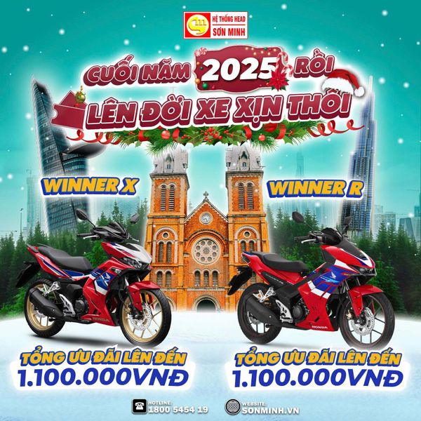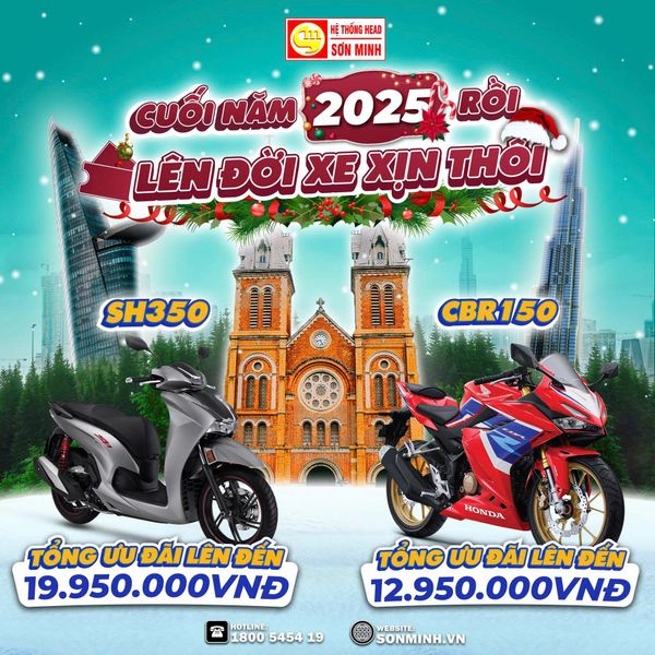 Khuyến mãi tháng 12/2025 tại HEAD Sơn Minh: Ưu đãi lên đến 19.950.000, quà tặng giá trị, hỗ trợ “Thu cũ đổi mới”. Áp dụng cho SH350, CBR150R, Winner R, Winner X, Vario 125, Sh Mode, ICON e:, Vision… Đây là thời điểm tốt nhất để mua xe đón Tết!