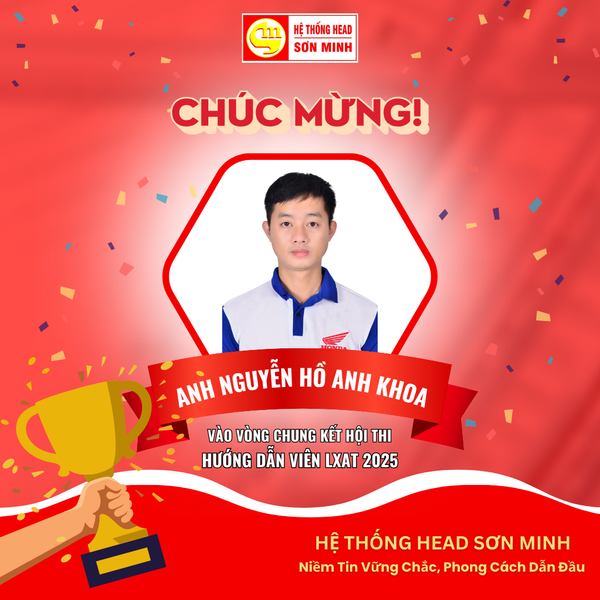 HEAD Sơn Minh tự hào chúc mừng anh Nguyễn Hồ Anh Khoa xuất sắc lọt vào Chung kết Hội thi Hướng dẫn viên LXAT 2025 do Honda Việt Nam tổ chức – khẳng định năng lực và sứ mệnh lan tỏa lái xe an toàn đến cộng đồng.